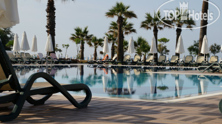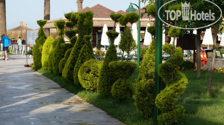 Территория очень красивая в принципе ухоженная, большая..много красивых цветов и растений..три бассейна один 16+, другой общий и третий детский, детский прохладный был почему то, наверное потому что навес там был, потом его сняли кстати, шезлонги потрепанные, хотя издалека на вид клевые и цвет красивый, но много покоцаных и какие то все перекрашенные..